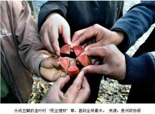 之前新聞報道過貴州省錦屏縣平秋鎮圭葉村,因一枚由本村村民發明刻制的“公章”而聞名全國。他們將刻有“平秋鎮圭葉村民主理財小組審核”字樣的印章分為五瓣,分別由四名村民代表和一名黨支部委員保管,村里的開銷須經他們中至少三人同意后,才可將其合并起來蓋章,蓋了章的發票才可入賬報銷。這枚印章被網友稱為“史上最牛公章”。