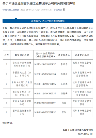 9月1日,中國兵器工業集團微信公眾號發布《關于不法企業假冒兵器工業集團子公司有關情況的聲明》。聲明稱,近期有不法分子通過偽造公章、相關材料等方式,將企業注冊為中國兵器工業集團有限公司下屬子公司,以中國兵器工業集團子公司名義開展業務,假冒國企進行虛假宣傳。