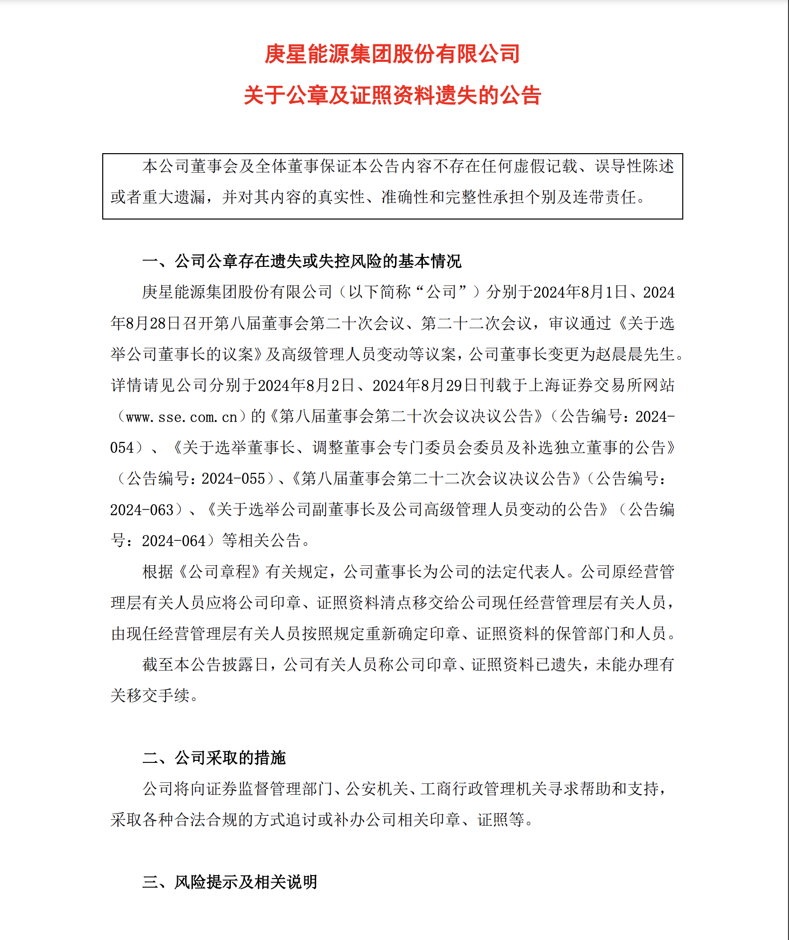 8月28日,庚星股份(600753.SH)發布公告,根據《公司章程》有關規定,公司董事長為公司的法定代表人,公司原經營管理層有關人員應將公司印章、證照資料清點移交給公司現任經營管理層有關人員,由現任經營管理層有關人員按照規定重新確定印章、證照資料的保管部門和人員。截至本公告披露日,公司有關人員稱公司印章、證照資料已遺失,未能辦理有關移交手續。