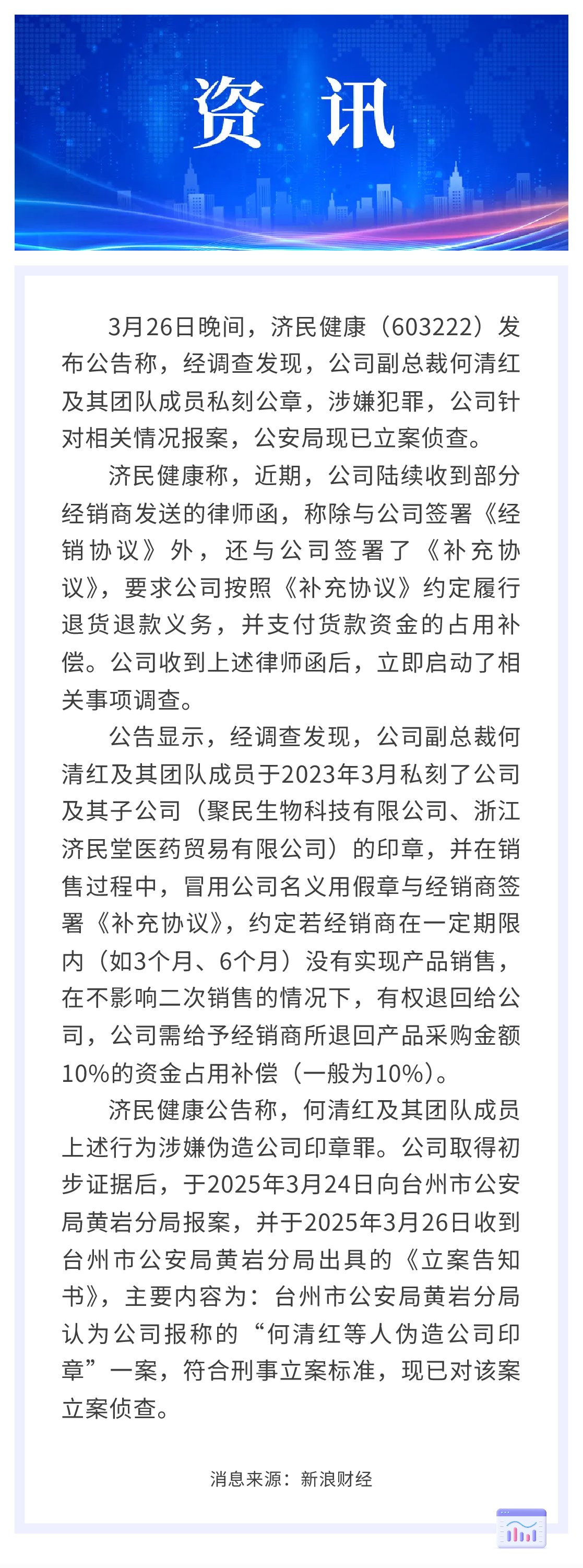 副總裁私刻公章與經(jīng)銷(xiāo)商簽約 濟(jì)民健康報(bào)案